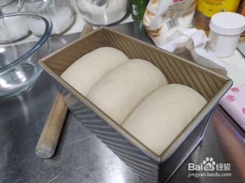 噔噔噔噔噔!完当作!放进吐司盒,烤箱35度喷水发酵1小时。