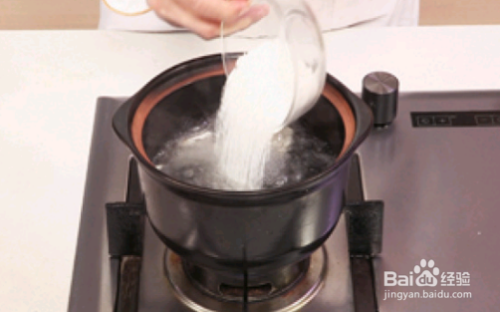 往砂锅中倒入适量净水,把西米倒进去,拌匀