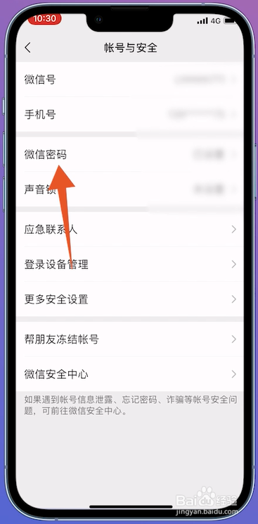 进入帐号与安全的页面之后,在页面中点击微信密码进入。