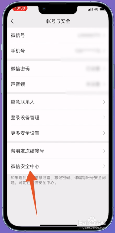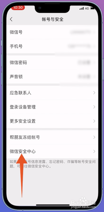 进入帐号与安全的页面之后,在页面中点击微信安全中间进入。