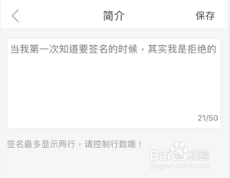 在简介界面可见默认的个性署名删除,键入本身想说的话点击生存。