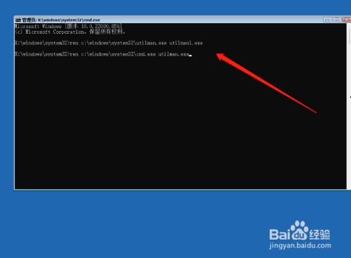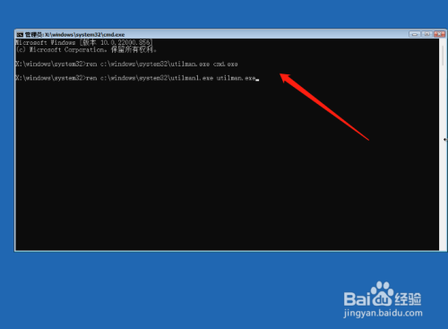 再输入:ren空格c:\windows\system32\utilman1.exe utilman.exe回车