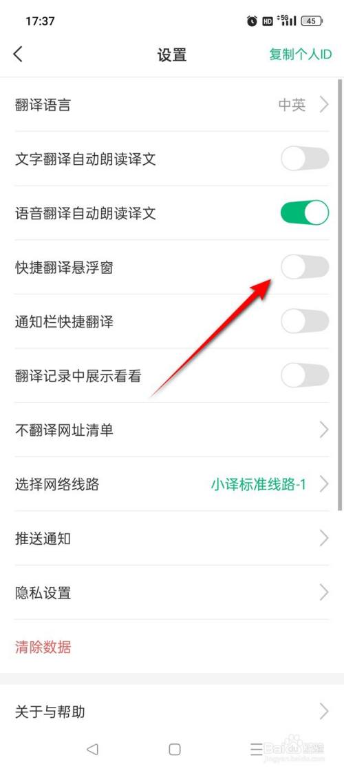 当“快捷翻译悬浮窗”旁的小滑块处于点暗状况时即暗示此时已禁用悬浮窗,点击小滑块。