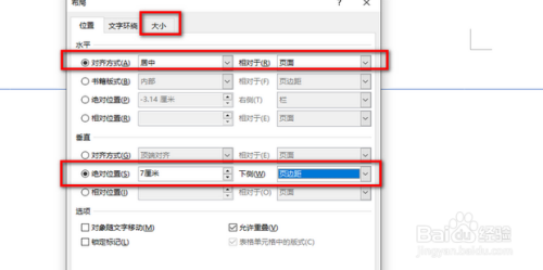 然后将对齐方式设置为居中,相对于设置为页面,绝对位置为7厘米,下侧为页边距,点击巨细。