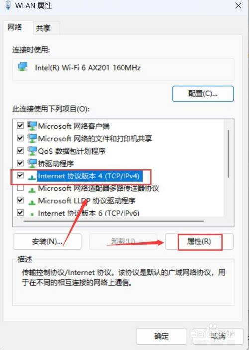 进入wlan属性,选择internet和谈版本4,点击“属性”。