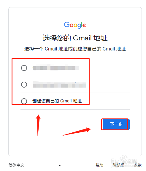 进入选择邮箱地址,输入邮箱地址,点击【下一步】。