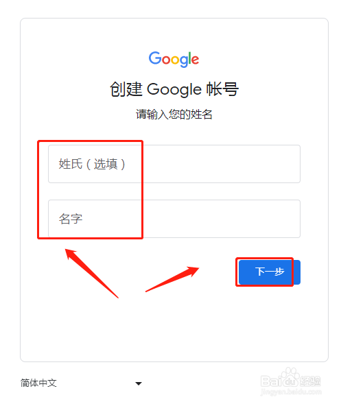 进入创建 Google 帐号,输入姓名,点击【下一步】。