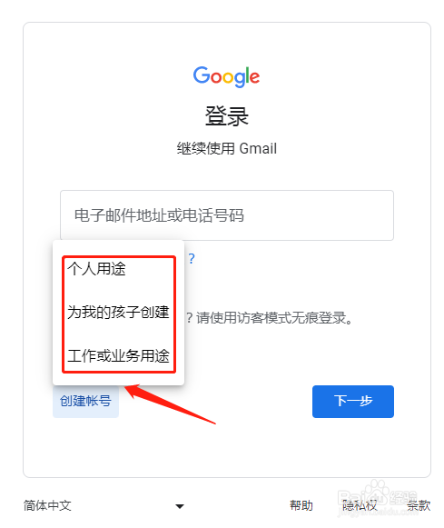 打开gmail邮箱地址,点击【创建帐号】。