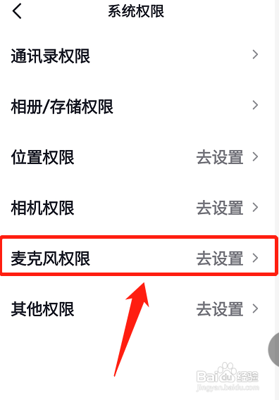 进入麦克风权限页面,点击去设置。