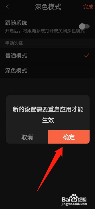 进入深色模式,勾选“平凡模式”,点击右上方的“完当作”。
