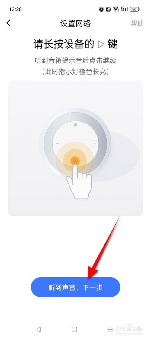 长按小度智能音箱上的箭头键,听到音箱提醒音后,点击“听到声音,下一步”。