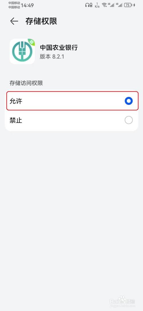 在存储权限页面,选择【许可】中国农业银行存储点击权限。
