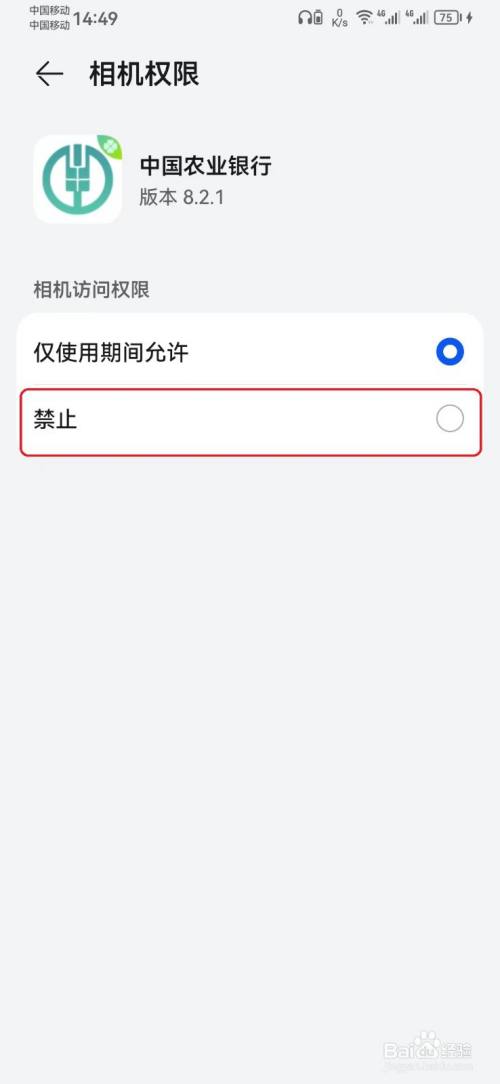 在相机权限页面,选择【克制】中国农业银行相机点击权限。