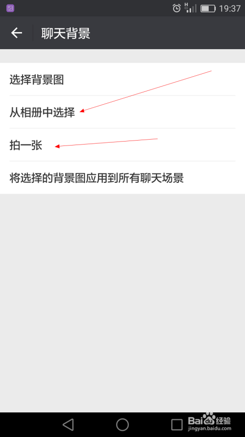 进入谈天配景,这里可以直接选择配景图(体系的),可以从相册中选择(把本身喜欢的图片生存在手机然后选择即可),拍一张(直接用相机即时拍的)。