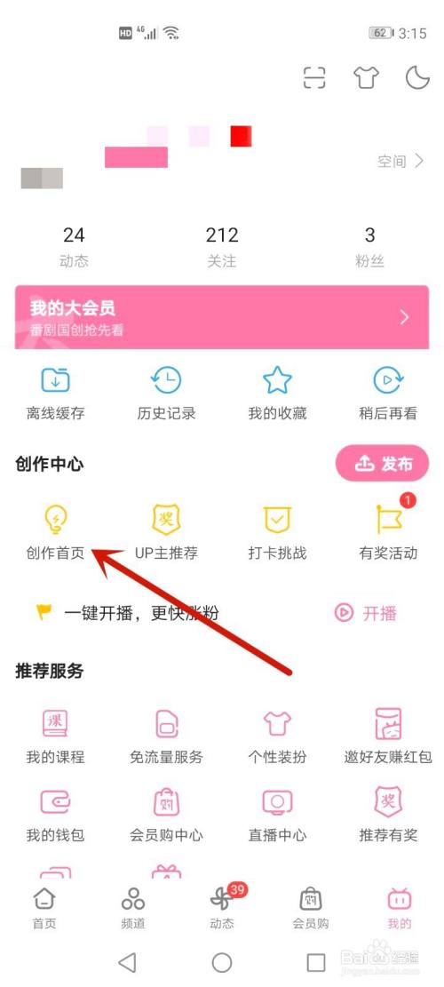 打开手机上哔哩哔哩 APP,打开创作首页。