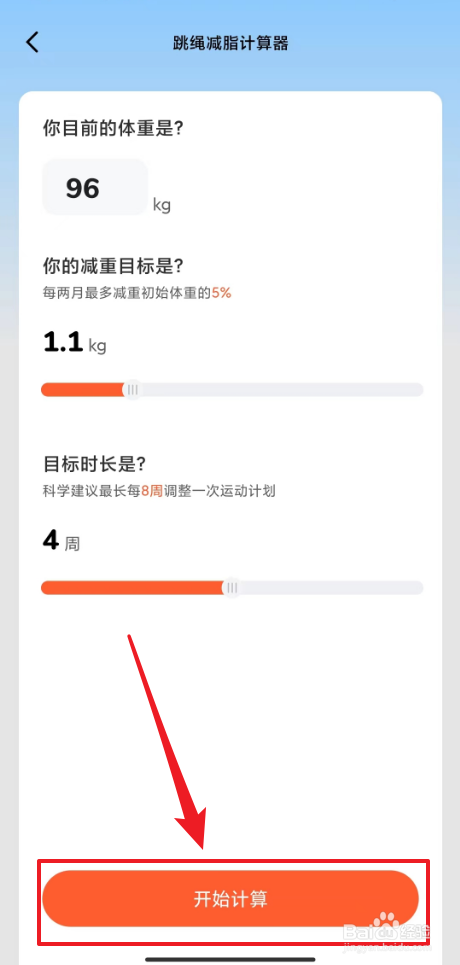 在【跳绳减脂计较器】页面,输入信息,点击【起头计较】按钮。