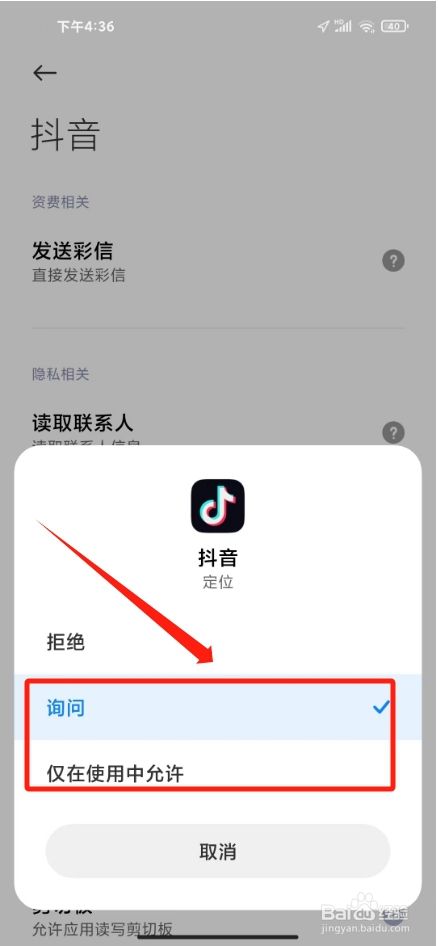 进入抖音定位,点击“扣问”或“仅在利用中运行”。