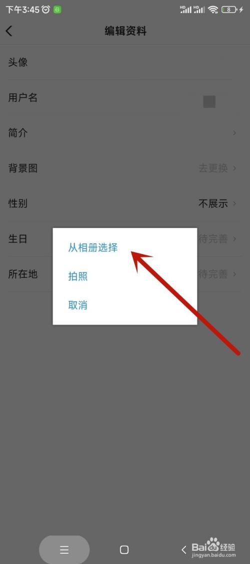在弹出页面,点击从相册选择,进入相册目次。