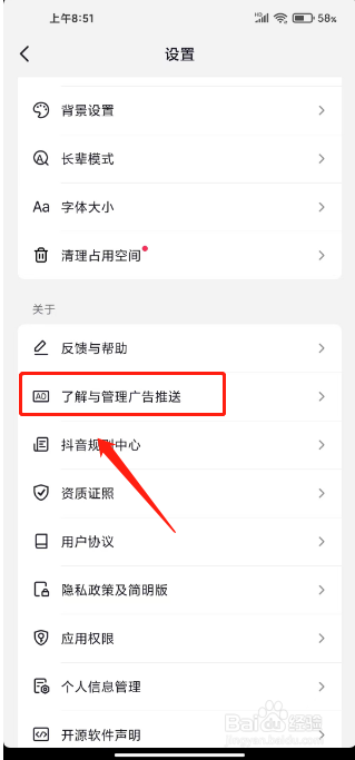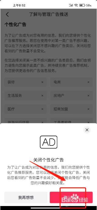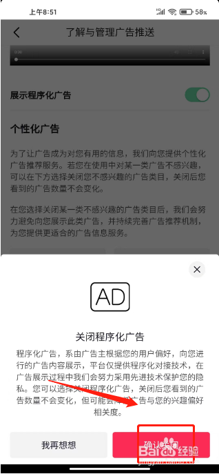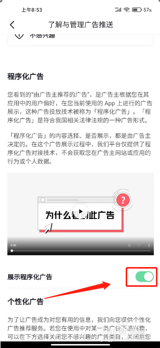 在相识与办理告白推送下滑屏幕到底部,点击【展示个性化告白】右侧按钮。