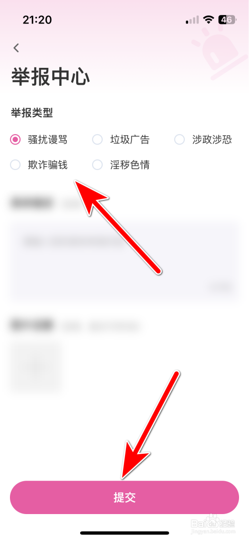 选择方针举报类型后,点击【提交】即可举报违规的谈天对象。