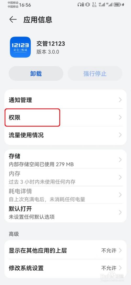 在应用信息页面,选择交管12123【权限】选项。