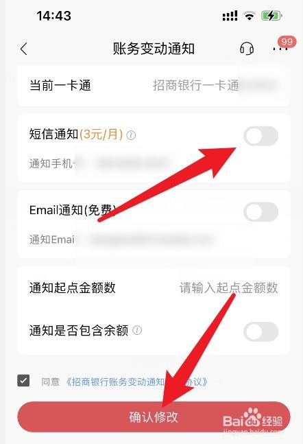 最后,如下,将【短信通知】后面按钮点击一下开启,勾选赞成,再点击【确认修改】即可开通余额变更短信提示