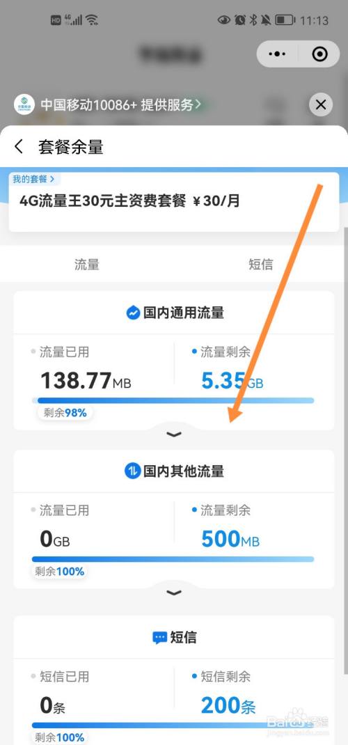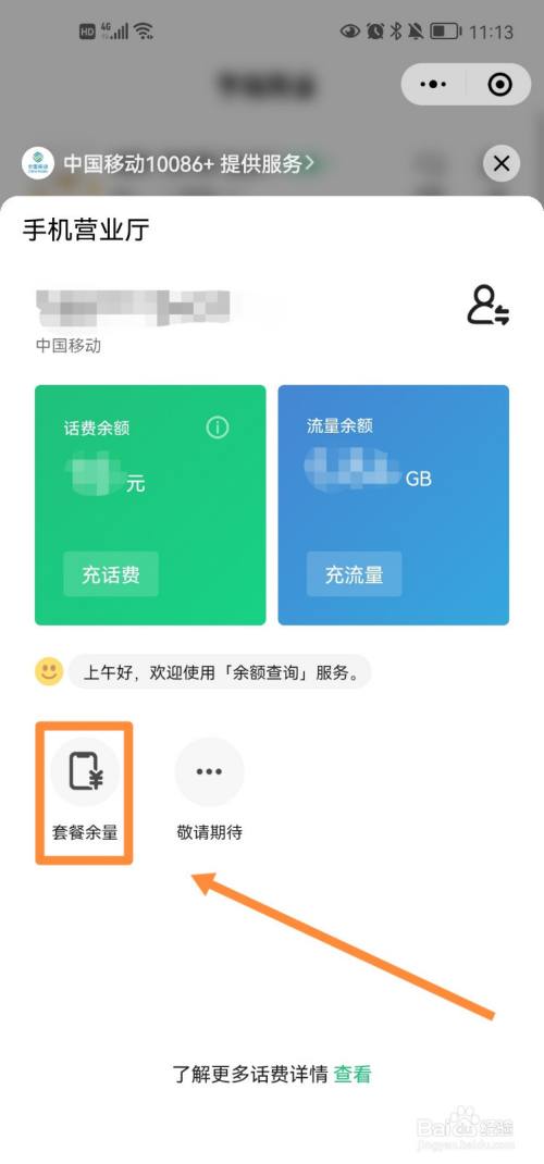 在【套餐余量】界面中,即可查看当前手机号的话用度、流量的利用环境。