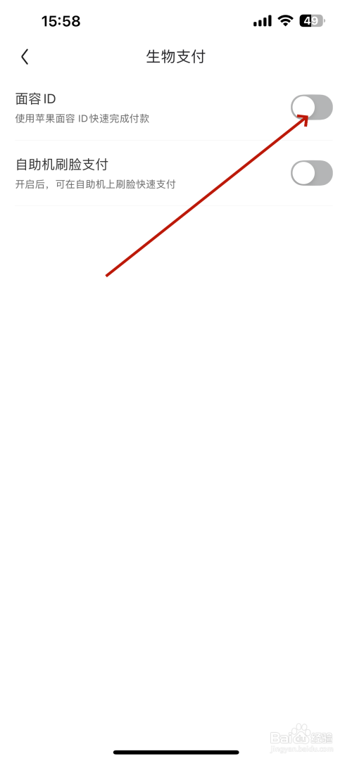打开生物支付的界面在面目面貌ID的选项“切换为开启”,