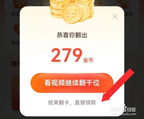 页面跳转后,可以看到翻出279金币,可以继续看视频翻卡,也可以点击【竣事翻卡,直接领取】,这样就完当作可以得到279金币。