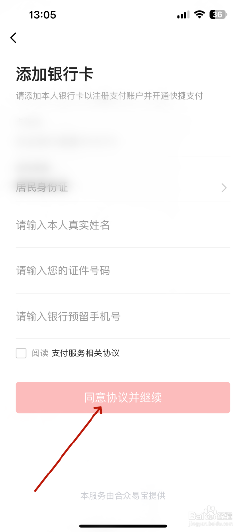 进入添加银行卡的页面填写信息等选择“赞成和谈并继续”按钮;