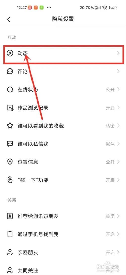 进入到隐私设置界面,点击“动态”。