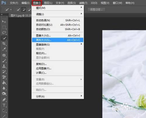 第二步:在菜单栏“图像”中,选择“画布巨细”。