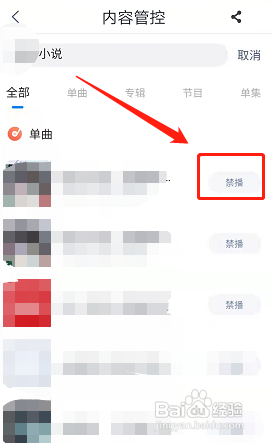 在内容管控诉页面搜刮小说,点击下方的禁播,即可克制孩子收听小说。