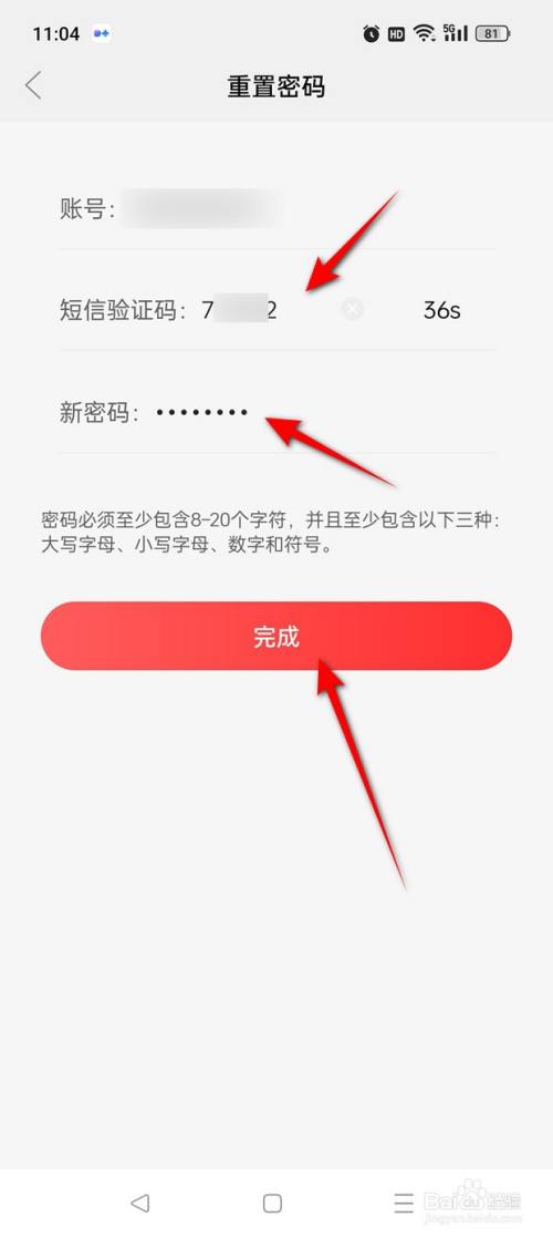 将收到的短信验证码填入,再填入新的密码,点击“完当作”即可重置。