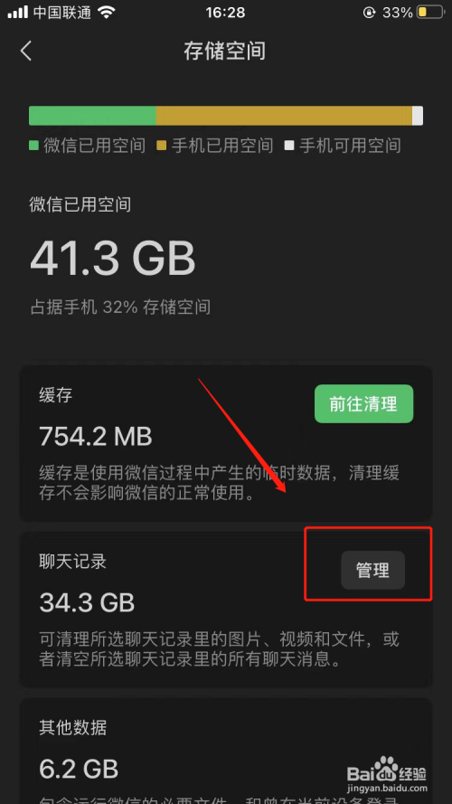 进入存储空间后可以看到缓存,谈天记载,其他数据所占的内存 选择【办理】就可以查看并删除微信摰友的谈天记载内存了