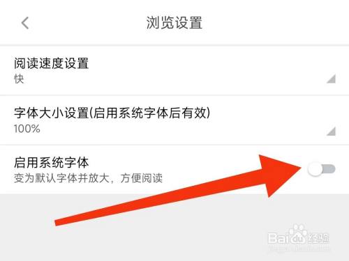 在浏览设置页面,点击【启用体系字体】右侧按钮,如图所示