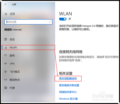 别的一种方式是借助电脑设置,桌面右下角右击WIFI图标,选择打开“收集和Internet”设置,进入后左侧点“WLAN”菜单,再进入“更改适配器选项”页面。
