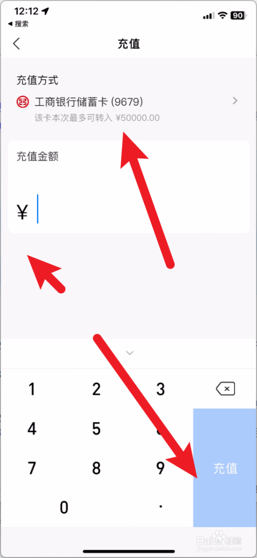 最后选择方才微信提现的银行卡,输入金额,点击充值即可。