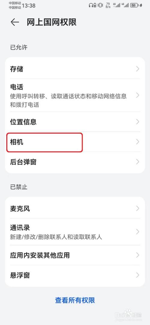 在网上国网权限页面,选择【相机】选项。