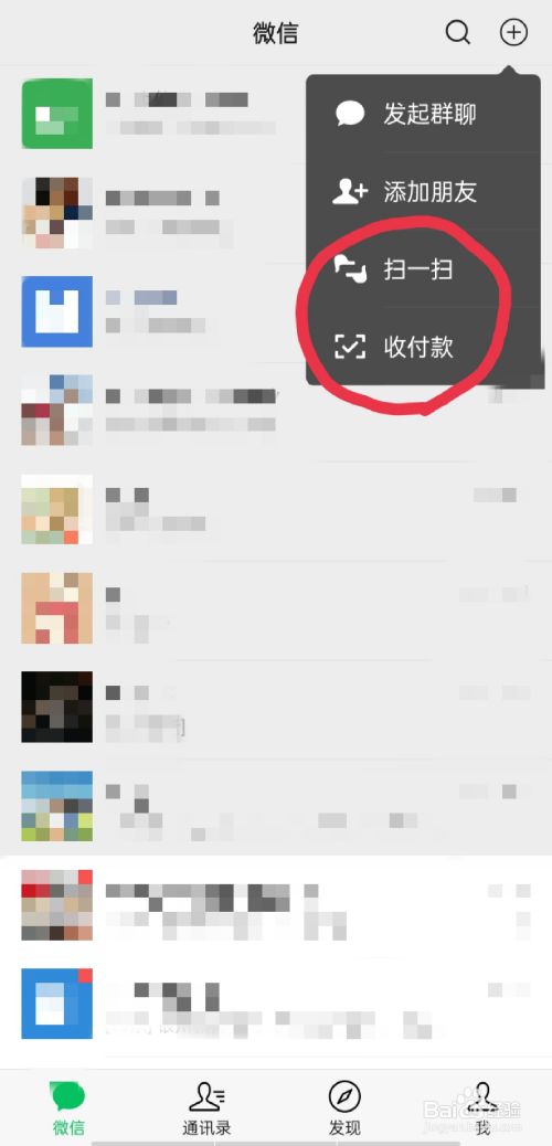要领一:打开微信,看到右上角的加号(+),点开加号,看到四个选项