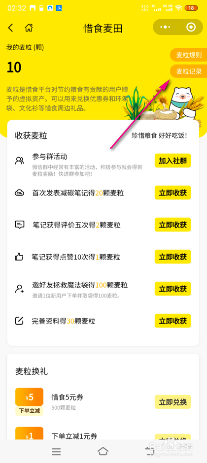 界面跳转,即可查看麦粒领取记载详情。