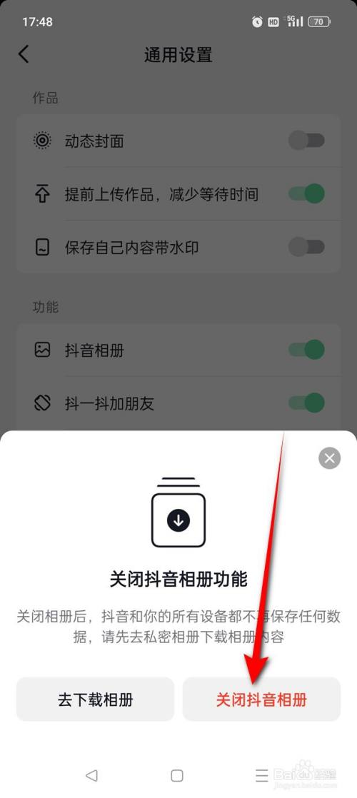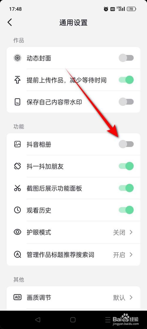 当“抖音相册”旁的小滑块处于点暗状况时即暗示此时已封闭抖音相册功效,此时点击小滑块。