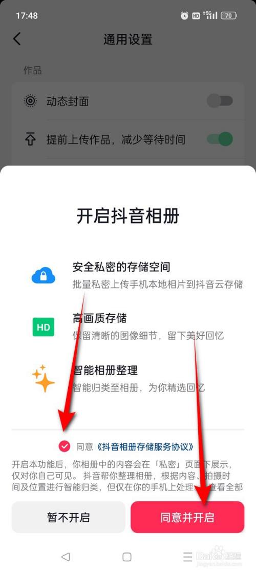 将“抖音相册”旁的小滑块点亮即可开启,此时再次点击小滑块。