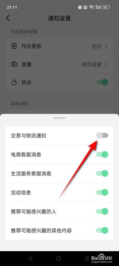将“生意业务与物畅通知”旁的小滑块点暗即可封闭。