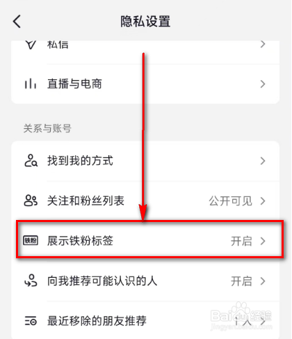 8.进入到隐私设置页面后,点击: 展示铁粉标签。