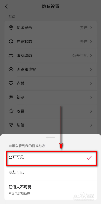 8.进入到隐私设置页面后,点击: 游戏动态。