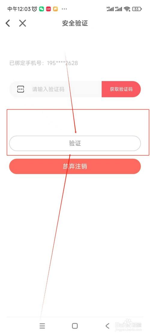 在验证界面中输入手机验证码后,点击"验证"