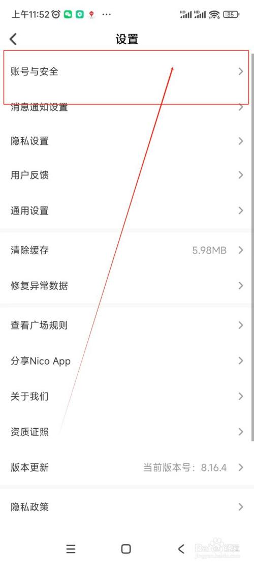 在设置界面中点击"账号与安全"