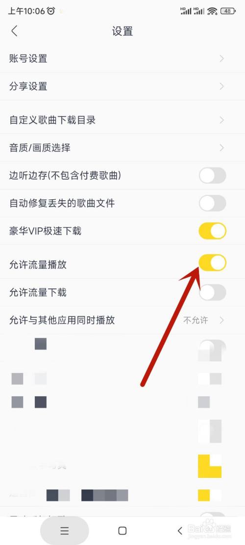 返回设置页面,许可流量播铺开关已打开,即暗示流量播放功效乐成开启。