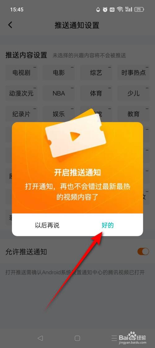 将"许可推送通知"旁的小滑块点亮即可开启。